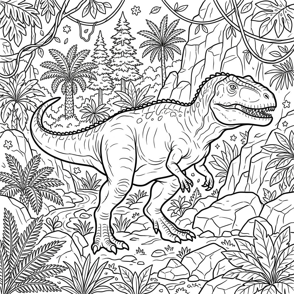 Embark on a thrilling journey to the age of dinosaurs with this captivating Giganotosaurus coloring page. Immerse yourself in a richly detailed prehistoric jungle, ready for your creative touch.