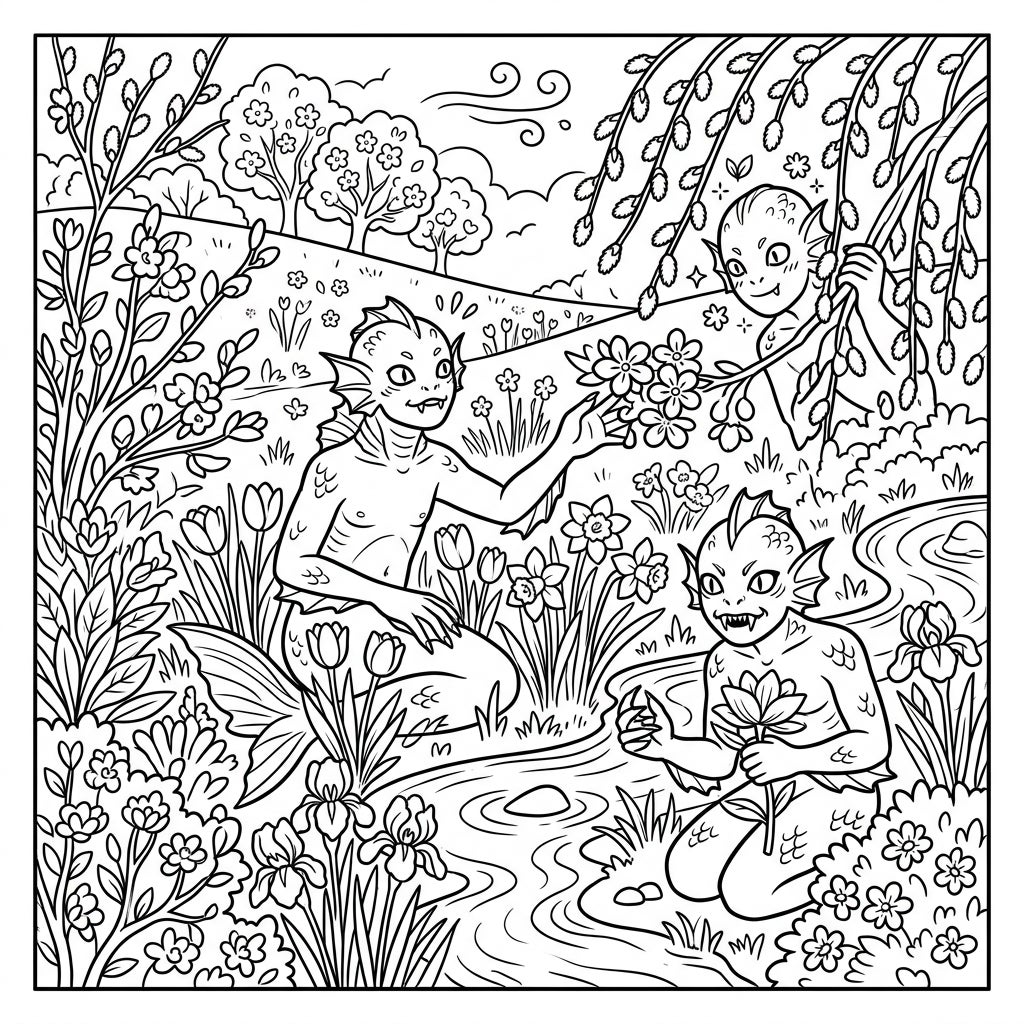 Unleash your creativity with this enchanting coloring page featuring mysterious gilled humanoids enjoying the beauty of a vibrant spring landscape. Discover a world where fantasy creatures interact with blooming flowers and serene natural elements, perfect for a peaceful coloring experience.