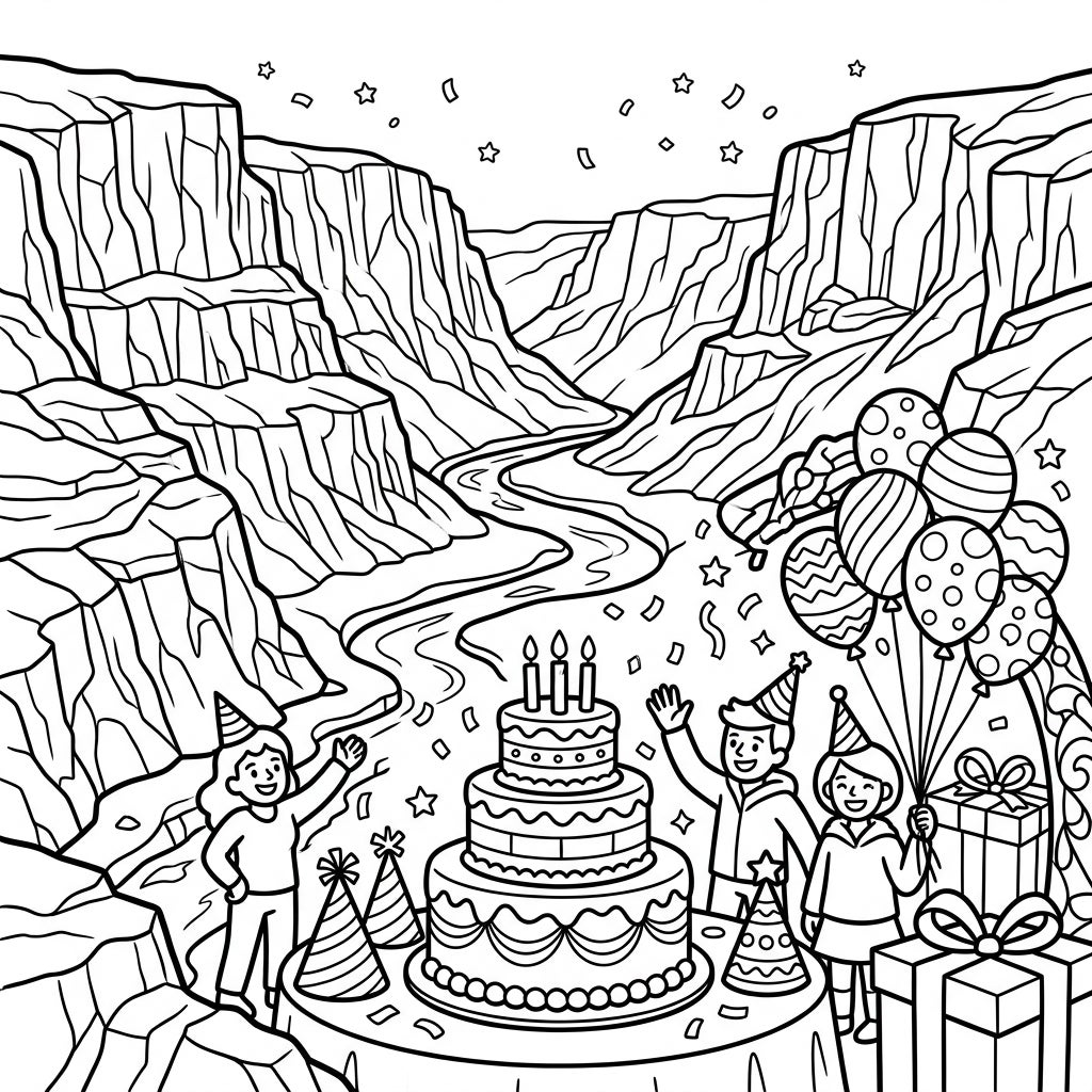 Let your imagination flow as freely as the river through the canyons! Consider using cool blues and grays to emphasize the ancient, icy feel of the glacial cliffs, contrasting them with warm, bright colors for the party elements like the cake, balloons, and presents. Don't forget to add splashes of metallic hues to the gifts and candles for extra sparkle. This coloring page offers ample opportunities to experiment with shading and texture, creating a masterpiece that celebrates both natural wonders and cherished moments.