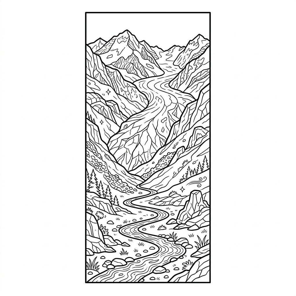 Immerse yourself in the breathtaking beauty of a glacial valley with this intricate bookmark coloring page. This design captures towering mountains and a serene river, perfect for a peaceful coloring escape.