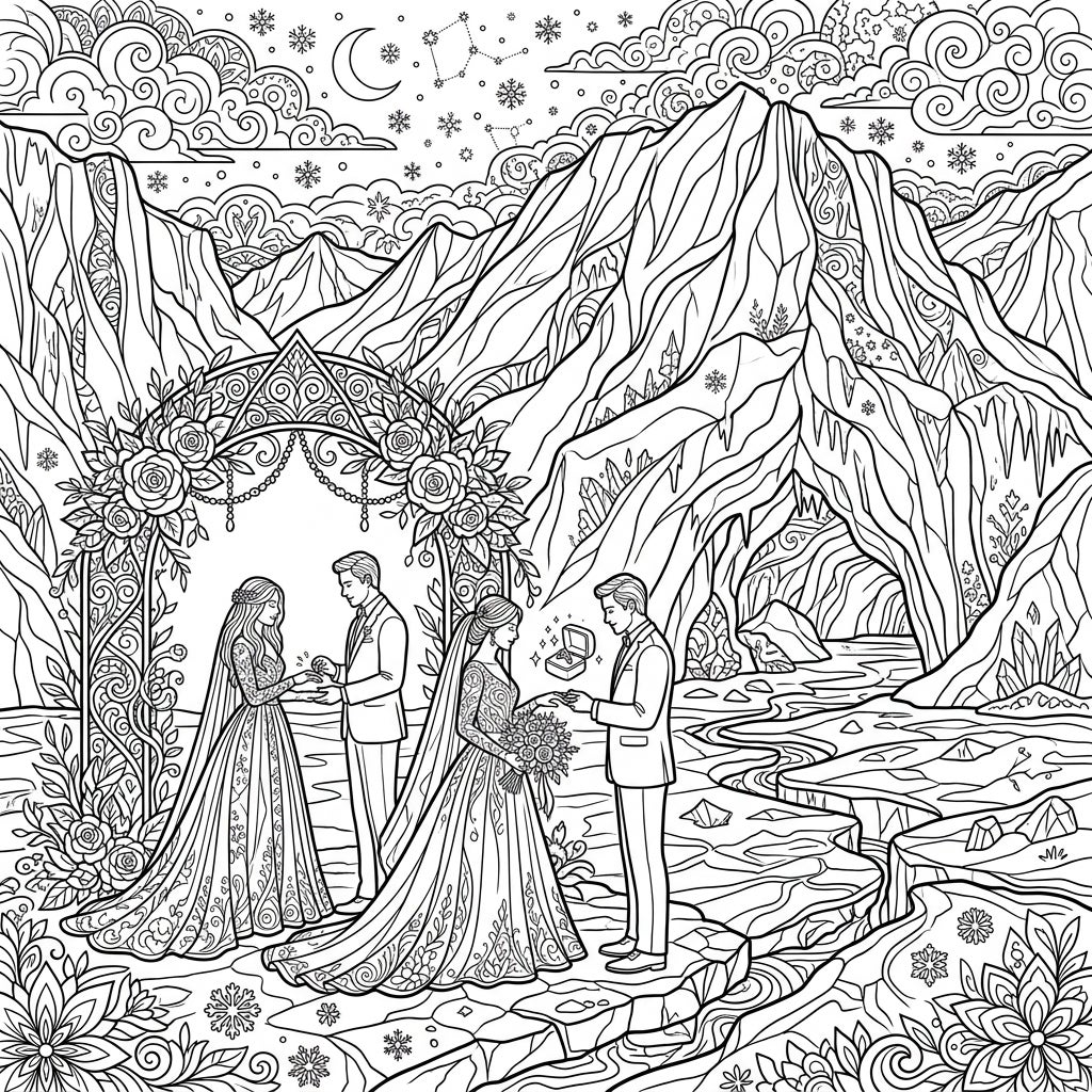 This captivating coloring page transports you to an extraordinary wedding celebration set amidst the breathtaking beauty of a glacial landscape. Observe the intricate details of two couples, elegantly dressed in wedding attire, exchanging vows and rings under a lush floral arch adorned with roses and delicate beadwork. The foreground showcases a pristine river winding through rugged, ice-carved terrain, while massive, majestic mountains rise dramatically in the background, their peaks textured with swirling patterns that evoke ancient ice formations.