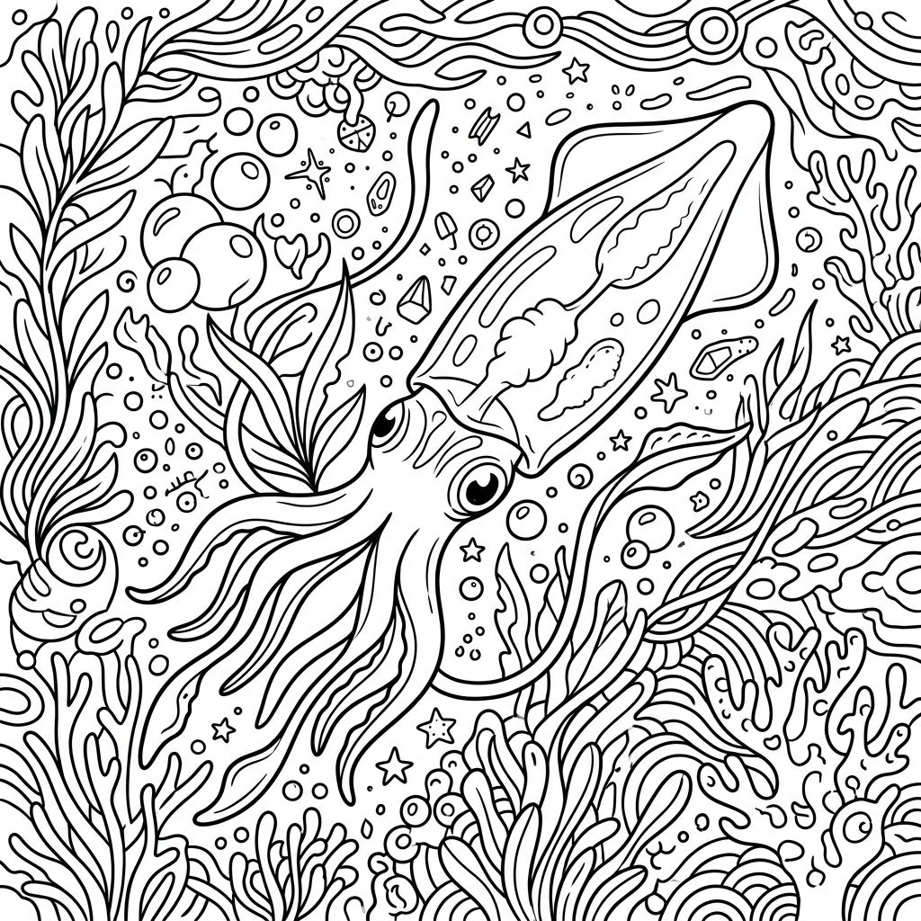 Embark on an artistic journey to the ocean's hidden depths with this stunning Glass Squid coloring template. This intricate design features a magnificent glass squid, known for its remarkably transparent body, gracefully navigating a vibrant underwater landscape. Surrounding this ethereal creature are swirling patterns of kelp, delicate corals, mysterious bubbles, and tiny, star-like bioluminescent plankton, creating a densely detailed scene that promises hours of engaging coloring.