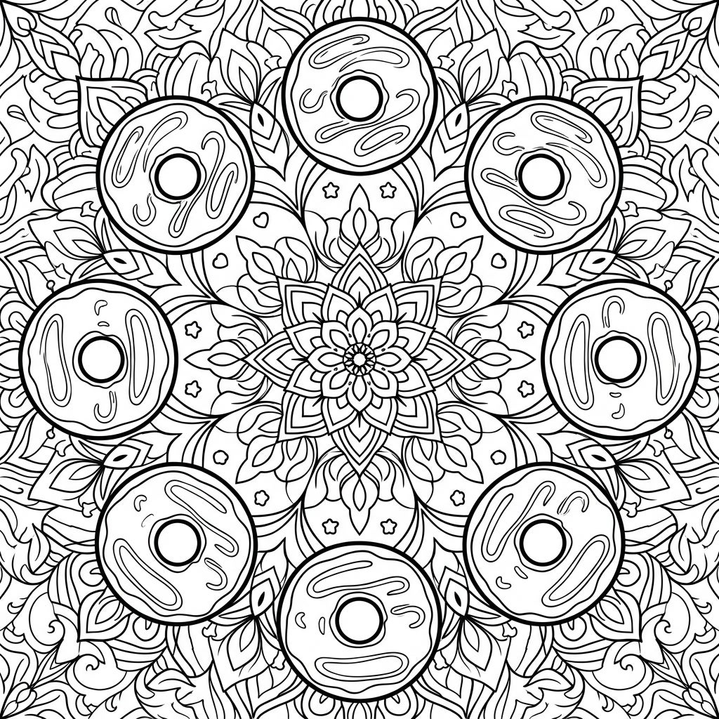 Prepare for a truly engaging coloring experience that combines the satisfying precision of a mandala with the comforting charm of everyone's favorite treat. As you fill in each section, from the swirling patterns of the background to the delectable details of the doughnuts, you'll find a delightful sense of calm and focus. It's an imaginative journey that celebrates both intricate artistry and the simple pleasure of a sweet indulgence.