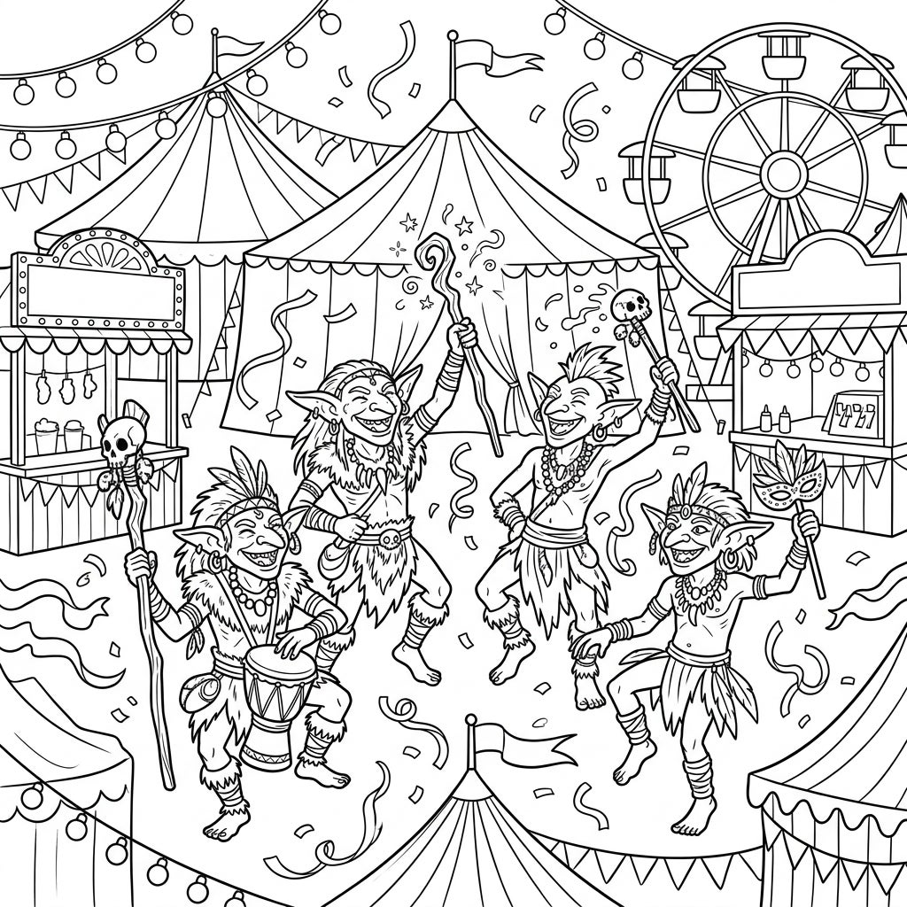 Dive into a world where mischievous Goblin Shamans let loose at a vibrant carnival, filled with music, magic, and merrymaking. This energetic coloring page brings together fantasy and festivity for an unforgettable artistic adventure.