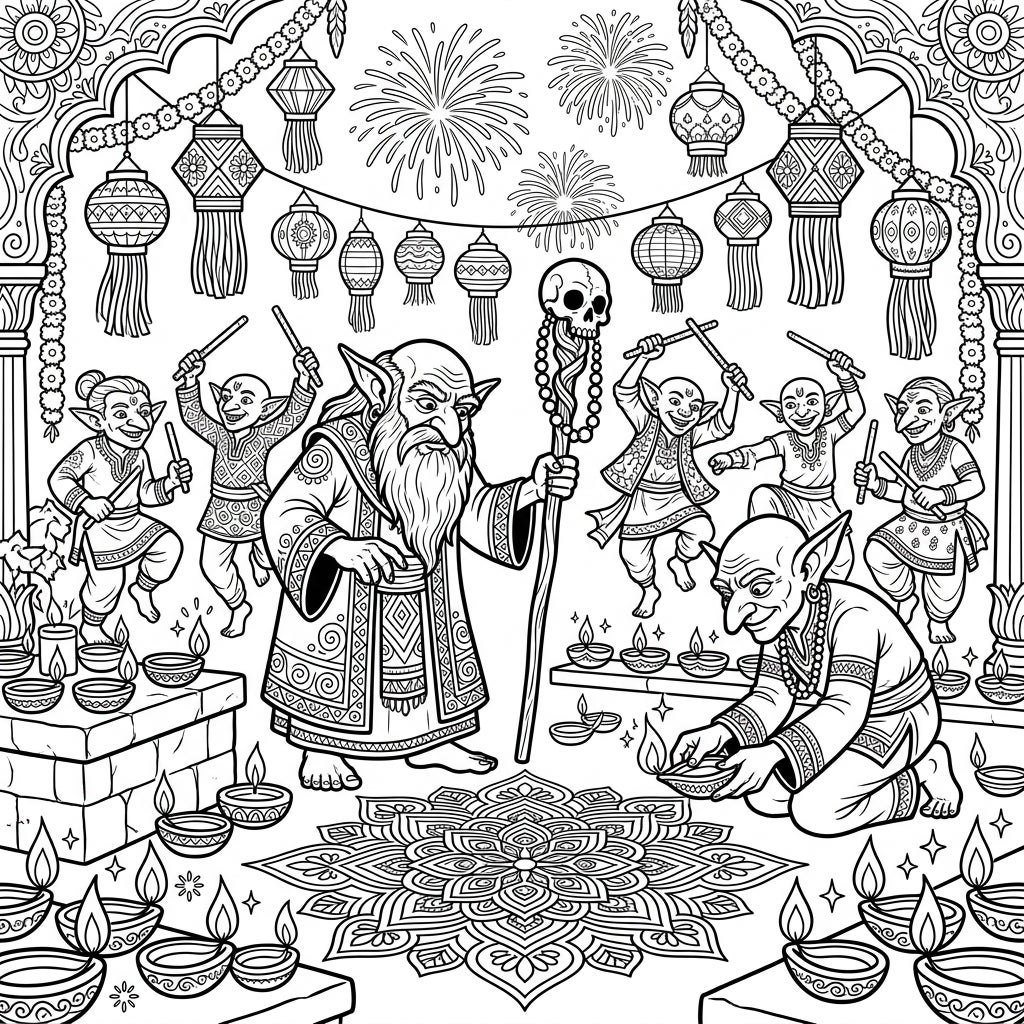 Step into a fantastical Diwali celebration with our unique coloring page featuring mischievous Goblin Shamans. This intricate design captures the joy of the Festival of Lights, adorned with traditional diyas, rangoli patterns, and festive fireworks.