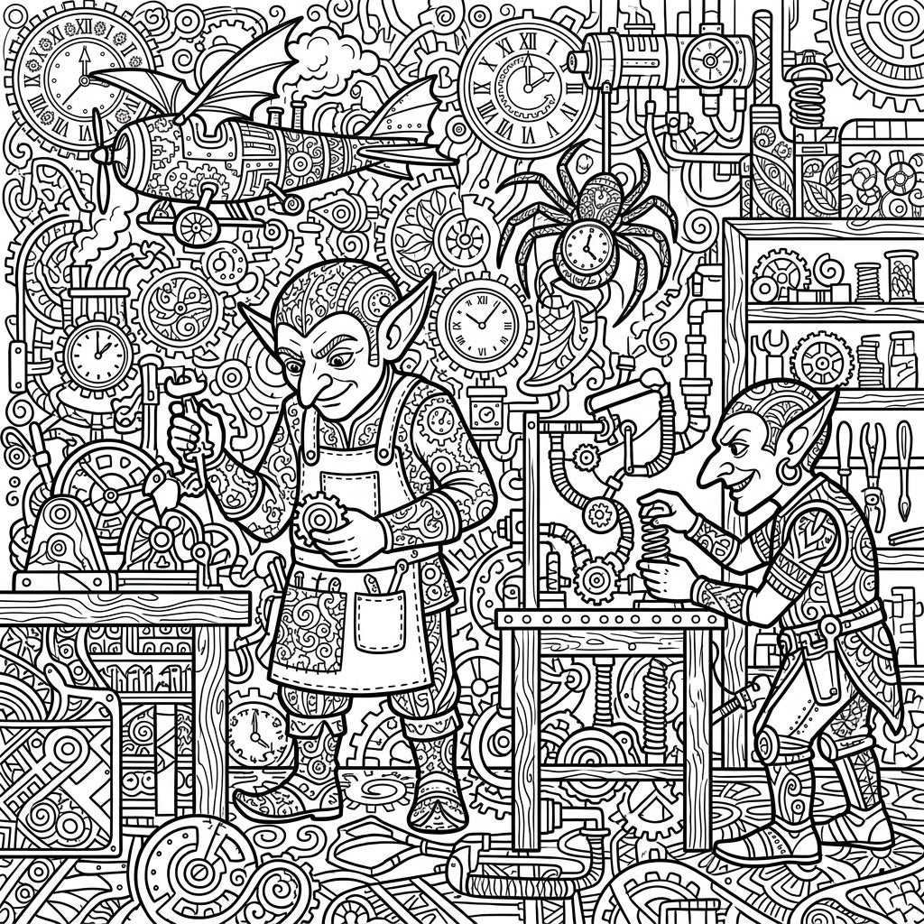 Step into the fantastical workshop of cunning Goblin Tinkers, brought to life with the mesmerizing patterns of Zentangle art. This intricate coloring page invites you to explore a world of mechanical marvels and whimsical designs.