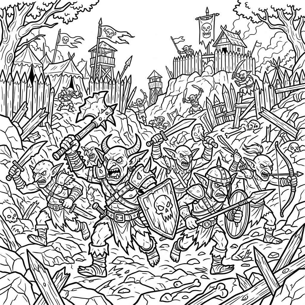 The scene is alive with the raw energy of a front-line assault, set against a rugged, broken landscape littered with debris and bones. In the background, a fortified goblin camp stands, complete with sturdy wooden palisades, menacing watchtowers, and rustic tents, all under the watchful gaze of skull-emblazoned flags. This isn't just a static image; it's a moment frozen in time, capturing the relentless charge of these legendary creatures as they raid and battle, offering a rich narrative for your coloring journey.