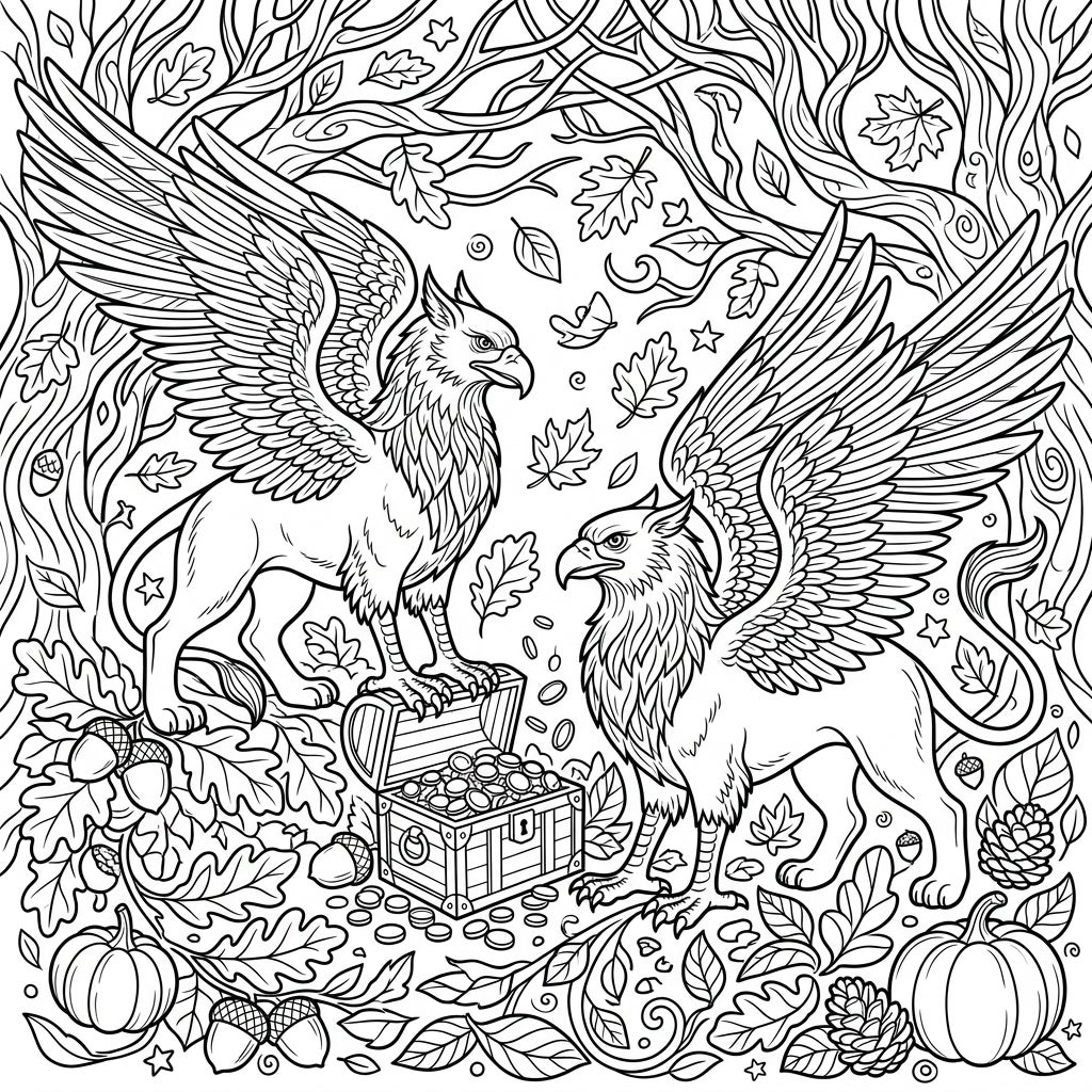 Step into a magical woodland scene where two majestic Golden Griffins stand guard over an overflowing treasure chest, brimming with ancient coins. This intricately designed coloring page captures every detail of their powerful forms, from feathered wings to fearsome talons, set against a backdrop of intertwining tree branches and a rich tapestry of autumn foliage. Look closely, and you'll discover plump pumpkins, scattered acorns, and delicate pinecones, all contributing to a truly immersive coloring experience.