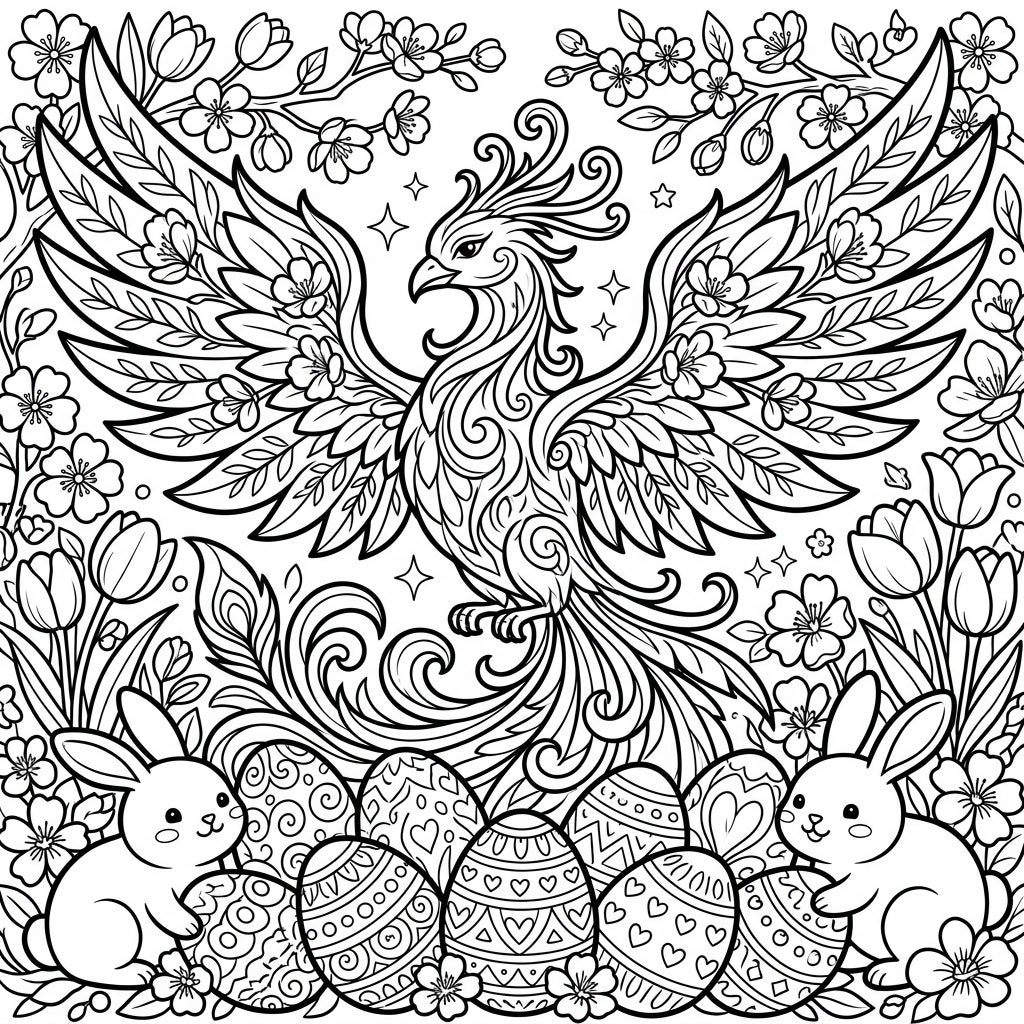This unique illustration beautifully blends the timeless symbolism of the phoenix – representing rebirth, resilience, and new beginnings – with the vibrant spirit of Easter and the arrival of spring. The scene evokes a feeling of renewal, celebration, and wonder, inviting colorists to explore a harmonious fusion of fantasy and festivity. It's an invitation to capture the magic of the season, from the gentle charm of the bunnies to the powerful grace of the phoenix, all while enjoying a moment of peaceful artistic expression.