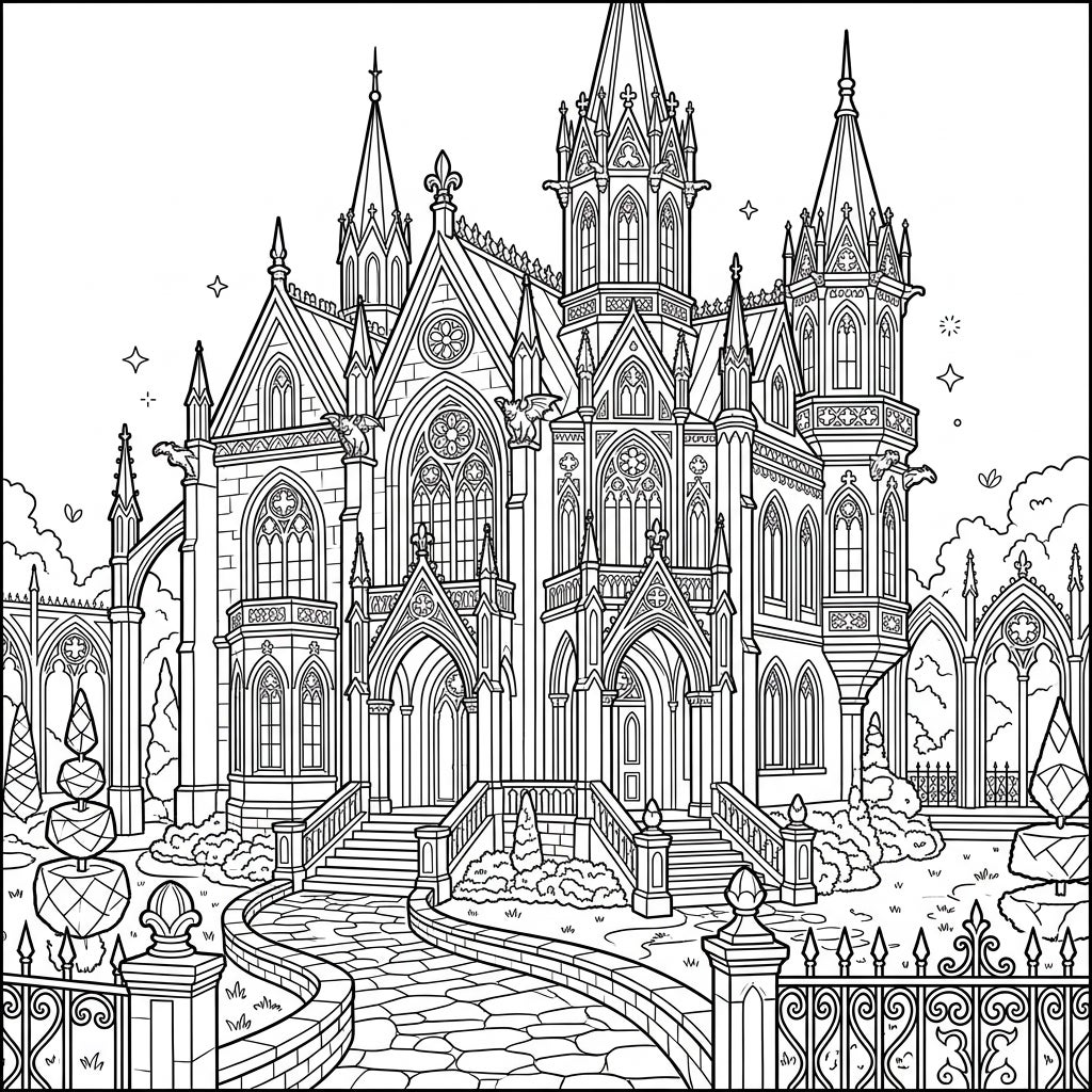 Delve into the breathtaking complexity of this Gothic Revival mansion coloring page. Every inch is adorned with the characteristic pointed arches, soaring spires, and elaborate tracery windows that define this architectural marvel. From the grand, welcoming staircase and winding stone path to the intricate details of the gargoyles perched high, this design offers a rich tapestry of lines and shapes awaiting your artistic touch.