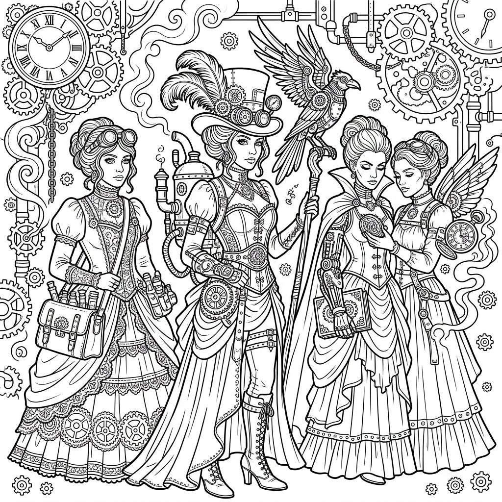 Step into a realm where dark magic meets intricate machinery with this stunning Gothic Steampunk Witches coloring page. Discover four enigmatic figures adorned in Victorian-inspired attire, blending fantasy and industrial charm for a truly unique artistic escape.