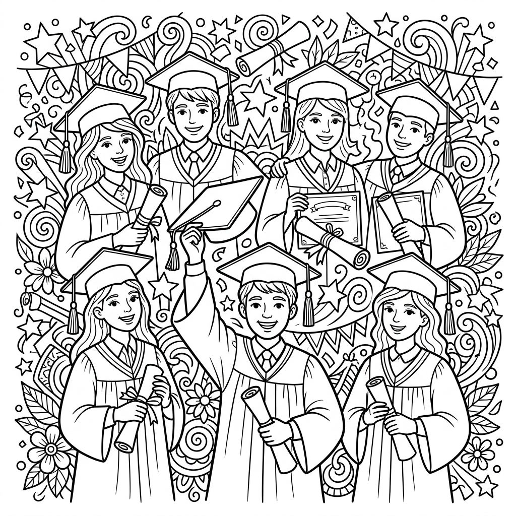 Step into the joyous world of academic achievement with this intricately designed graduation coloring page. Featuring a group of seven beaming graduates, each proudly adorned in their cap and gown and clutching their hard-earned diplomas, this template captures the essence of a significant milestone. The entire page is a canvas of celebration, densely packed with delightful details such as festive confetti, whimsical swirling patterns, cheerful stars, and decorative banners, ensuring a rich and engaging coloring experience without any empty spaces.