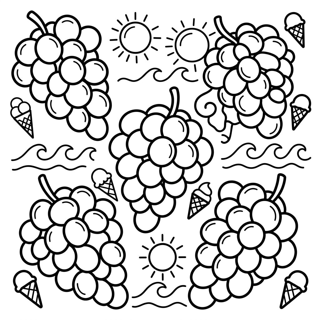 Get ready for a delightful coloring adventure with our 'Grapes and Summer Fun' page, specially crafted for your little artist! This charming design features multiple plump bunches of grapes, inviting your child to fill them with vibrant purples and greens. Interspersed throughout are cheerful suns, playful wavy lines representing the cool ocean, and sweet ice cream cones, all designed with ultra-thick lines and large, simple shapes perfect for tiny hands to grasp crayons and develop fine motor skills.