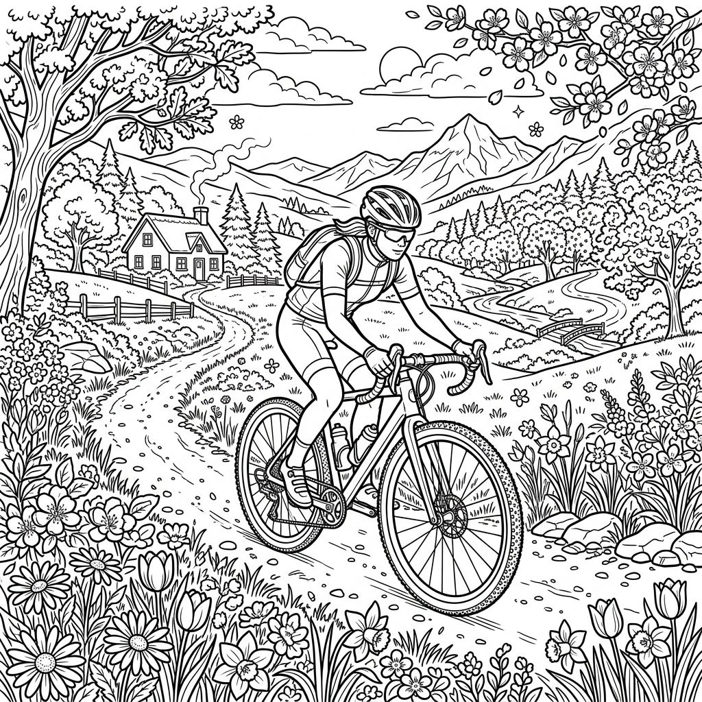Embark on an artistic journey with this delightful coloring page featuring a gravel bike enthusiast amidst a vibrant spring landscape. Discover blooming flowers, rolling hills, and a serene countryside as you bring this scene to life.