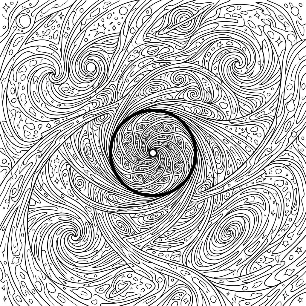 Explore the mysteries of the universe with this captivating Gravitational Singularity coloring page. Its intricate design features swirling cosmic patterns, stars, and warped spacetime, offering a truly immersive coloring experience.