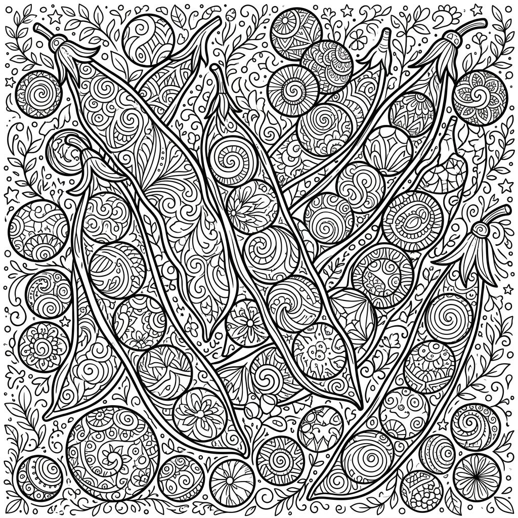 Dive into a world of intricate detail with this stunning adult coloring page featuring green beans and peas. Perfect for experienced colorists seeking mindful relaxation and a creative challenge.
