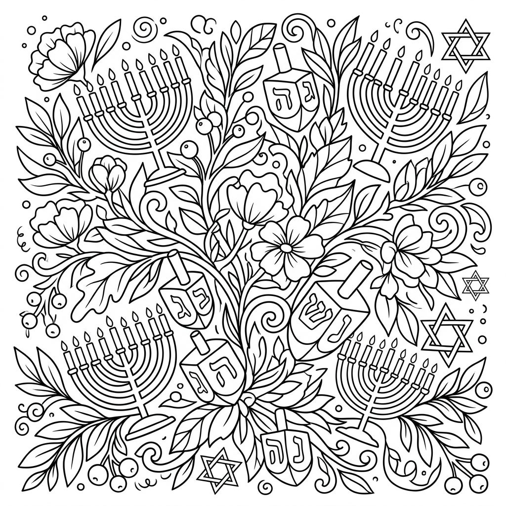 Immerse yourself in the spirit of Hanukkah with this beautifully intricate coloring page, intertwining traditional symbols with lush botanical motifs. Discover menorahs, dreidels, and Stars of David nestled within a vibrant tapestry of leaves and flowers, perfect for creative relaxation.