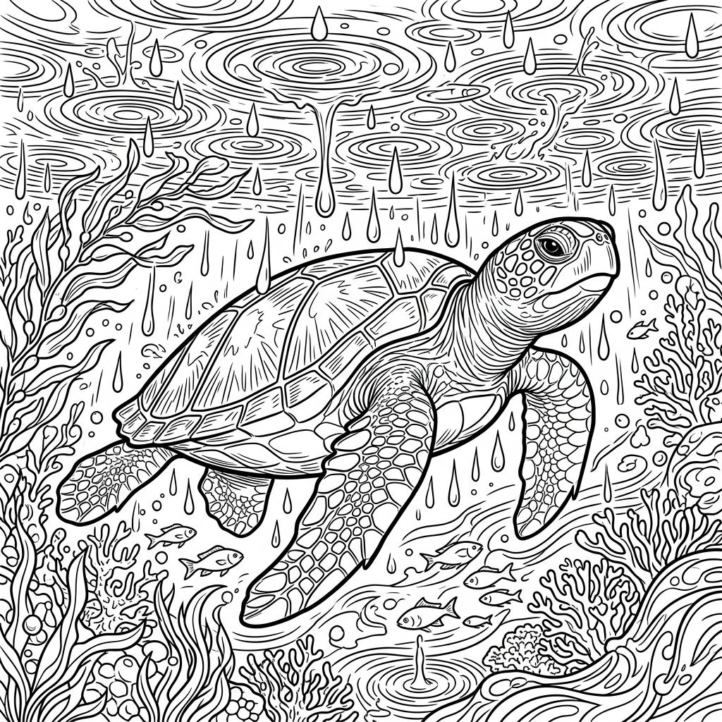 Dive into a tranquil underwater world with this captivating coloring page featuring a magnificent Green Sea Turtle. Observe its detailed shell and flippers as it glides gracefully through an ocean scene. The surrounding environment is rich with intricate seaweed, delicate coral formations, and schools of small fish, all waiting to be brought to life with your favorite colors. Above, a gentle rain creates a mesmerizing pattern of raindrops and ripples on the water's surface, adding a unique atmospheric touch to this marine masterpiece.