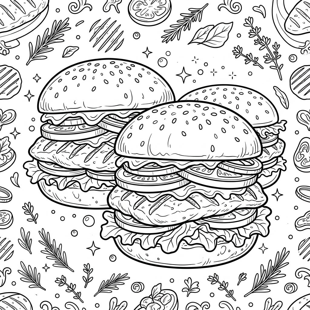 Dive into a delectable coloring experience with our intricately designed grilled chicken burgers template. This vibrant page features three generously stacked burgers, each showcasing a sesame seed bun, a juicy grilled chicken breast with authentic grill marks, crisp lettuce, ripe tomato slices, and delicate onion rings. The background is a delightful medley of food-themed elements, including aromatic rosemary sprigs, fresh basil leaves, extra tomato and onion slices, and stylized grill patterns, creating a full and engaging canvas for your artistic touch.