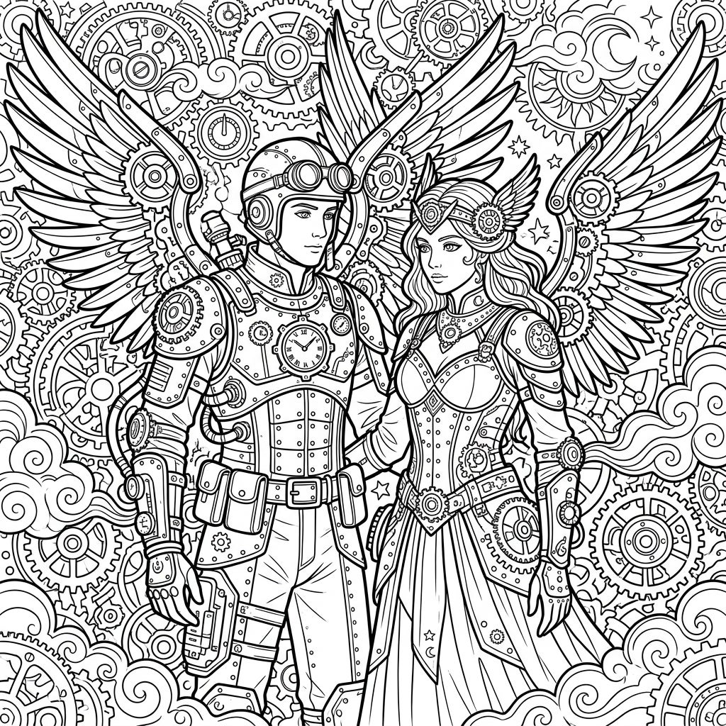 This captivating coloring page presents two majestic Guardian Angels, reimagined with an enthralling steampunk aesthetic. Observe the male figure, adorned in a sophisticated armored suit complete with goggles, riveted plates, and even a working clock integrated into his chest. Beside him, the female angel exudes elegance in her detailed corseted gown, intricate headpiece, and gauntlets, all embellished with gears and brass elements. Both figures are graced with impressive, multi-layered mechanical wings, ready to take flight through a fantastical realm.