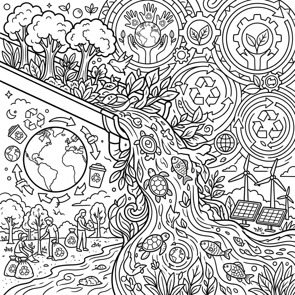 Get ready to unleash your creativity with this detailed template. Consider using a palette of rich greens for the foliage, varying shades of blue for the flowing water, and earthy tones for the land and people. Experiment with different textures and shading techniques to give depth to the intricate recycling symbols and gears. This coloring page provides a wonderful opportunity to reflect on your role in protecting the environment while enjoying a rewarding artistic challenge. Grab your pencils or markers and let your colors tell a vibrant story of hope and renewal for Earth Day!