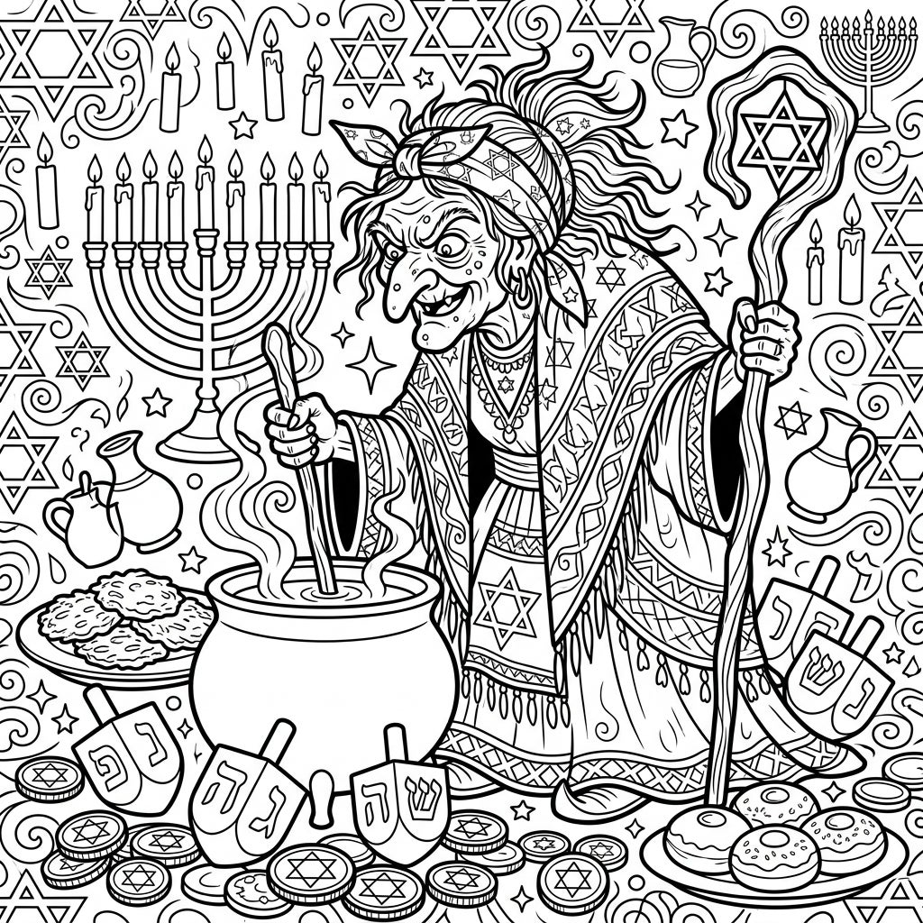Dive into a richly detailed coloring scene where an archetypal hag takes center stage, her mischievous gaze fixed on a bubbling cauldron, perhaps brewing up some magical latkes! She's adorned in a beautifully patterned dress and headscarf, creating a striking silhouette against a background brimming with festive Hanukkah symbols. Look closely to discover a grand menorah alight with candles, spinning dreidels, stacks of gelt coins, delicious donuts, and traditional pitchers, all woven into an intricate tapestry of Stars of David and swirling designs.