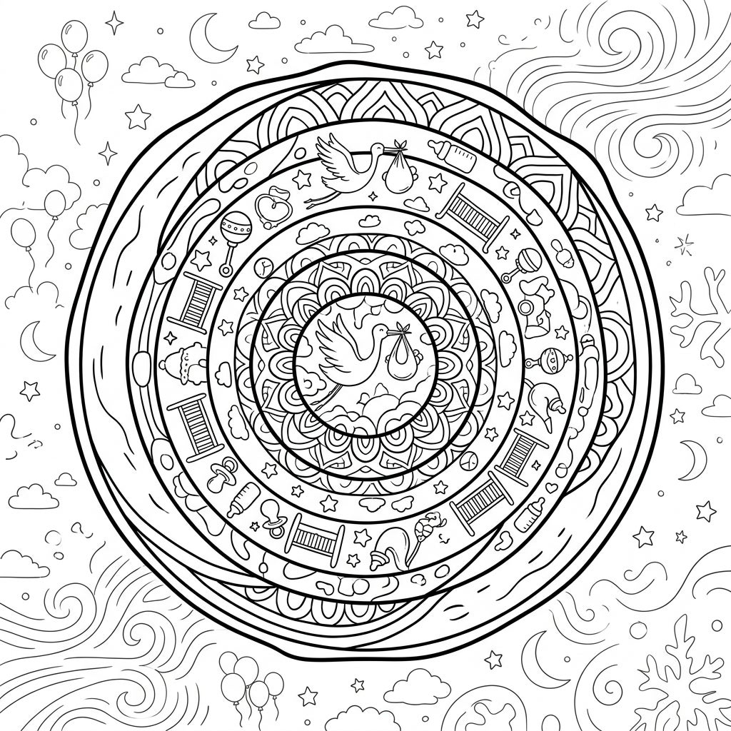 Dive into a world where nature's intricate beauty meets the heartwarming joy of a new arrival. This enchanting coloring page presents a 'Hail Core' design, reimagined as a stunning mandala. Its concentric layers are adorned with charming baby shower elements, including a sweet stork carrying a bundle of joy at its heart, surrounded by tiny cradles, baby bottles, pacifiers, and playful rattles. Delicate stars, clouds, moons, and balloons dance in the background, completing this whimsical scene.