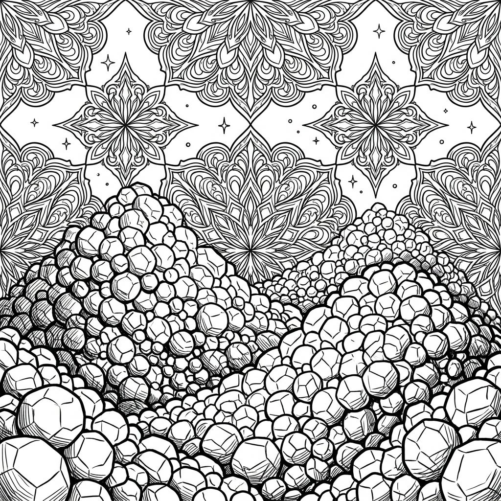 Step into a striking scene where nature's raw power meets intricate artistry. This captivating coloring page presents vast, textured hail drifts piled deep in the foreground, each irregular shape begging for your creative interpretation. Above this frozen landscape, a background of ornate, complex patterns unfolds, reminiscent of gothic lace or crystalline frost, ensuring every inch of the canvas provides a rich and engaging coloring experience.