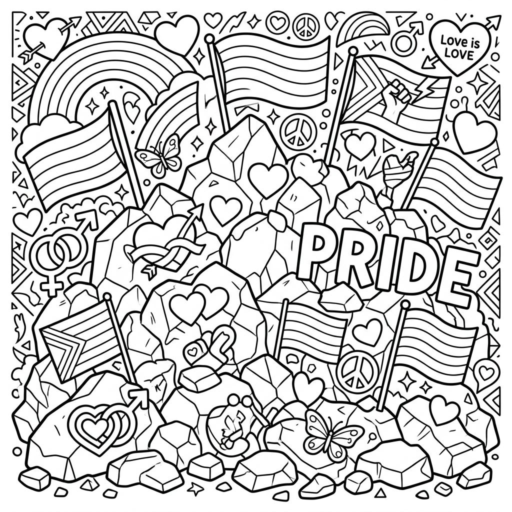 Step into a world where frosty landscapes meet vibrant celebration with our 'Pride Hail Drifts' coloring page. This intricate design features a dynamic pile of stylized boulders, representing the unique concept of hail drifts, meticulously detailed to offer a satisfying challenge for teen colorists. Each rock formation is adorned with a rich tapestry of symbols – from waving Pride flags and majestic rainbows to intertwining hearts, peace signs, and gender symbols – all inviting your artistic touch.