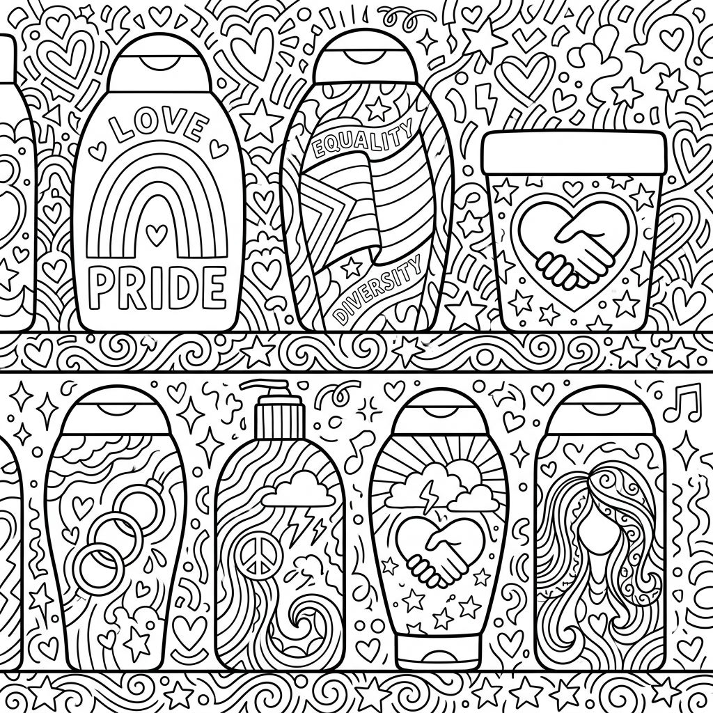 Immerse yourself in a vibrant celebration of love and diversity with this unique Pride-themed conditioner coloring page. Each bottle features powerful symbols of equality, making it a perfect activity to honor Pride Month.
