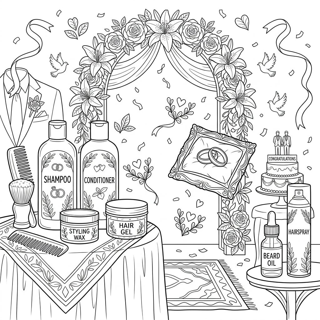 Prepare for a special day with this elegant coloring page, blending men's grooming essentials with the romance of a wedding celebration. Discover detailed illustrations of shampoos, conditioners, and styling products set against a beautiful bridal arch and wedding elements.