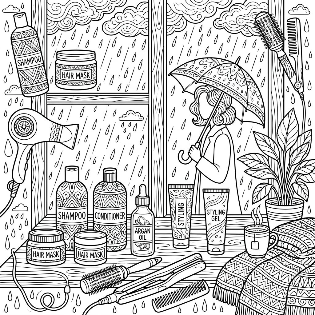 Curl up indoors with this delightful haircare coloring page, featuring all your favorite products against a serene rainy day backdrop. It's the perfect way to unwind and embrace some creative self-care.