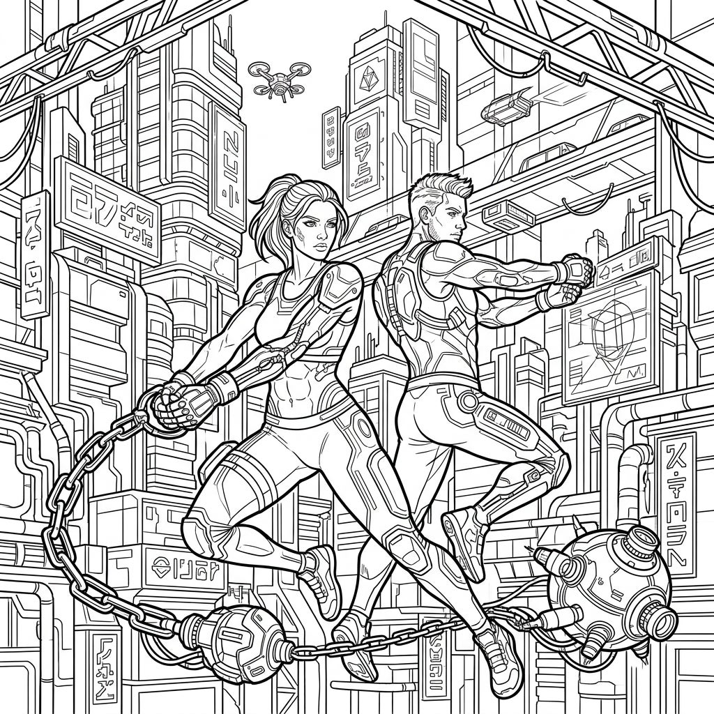 Step into a neon-drenched future where elite hammer throwers defy gravity in a bustling cyberpunk city. This dynamic coloring page captures two powerful athletes amidst high-tech urban structures, offering an electrifying artistic journey.