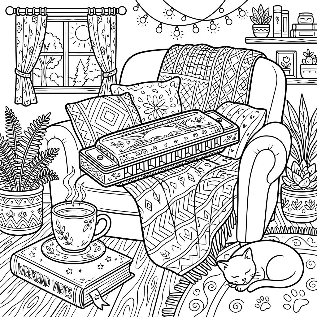 Discover a beautifully detailed scene designed for ultimate relaxation, centered around a decorative harmonica resting gently on a plush armchair. Every element in this cozy setting, from the intricate patterns on the blanket and cushions to the delicate steam rising from a warm cup, invites your artistic expression. Potted plants flank the chair, adding a touch of natural tranquility, while a friendly cat slumbers peacefully on a textured rug, enhancing the quiet charm of this interior.