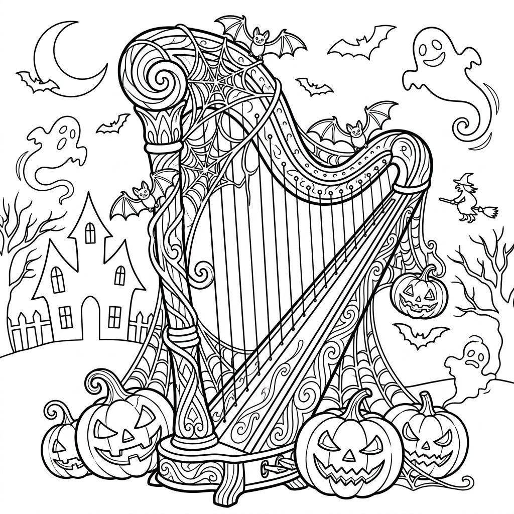 Discover the magic of Halloween with this enchanting coloring page featuring a beautifully haunted harp. Adorned with spooky details and surrounded by classic Halloween scenes, it's perfect for a creative escape.