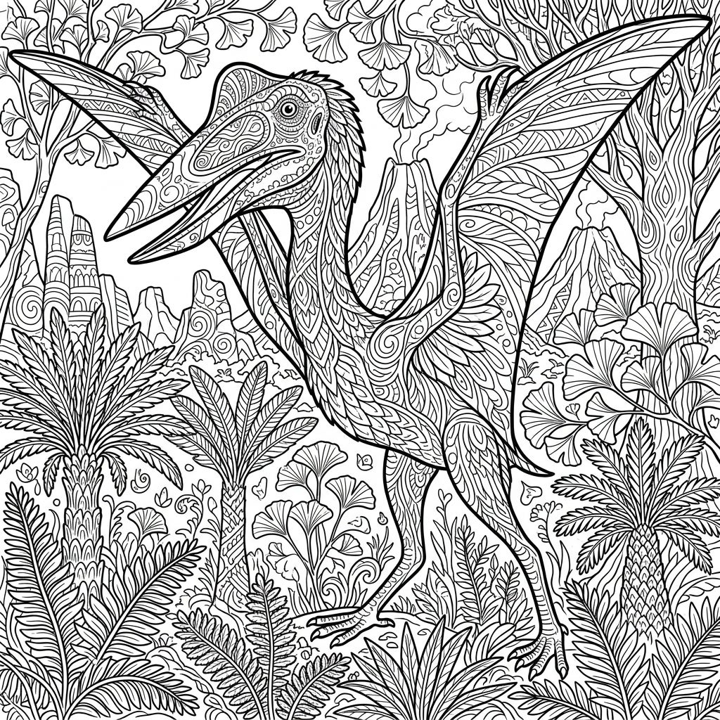 Explore the ancient world with this stunning Hatzegopteryx adult coloring page, designed with intricate patterns for a deeply engaging experience. Dive into a prehistoric landscape filled with detailed flora and a magnificent flying reptile, perfect for mindful relaxation.