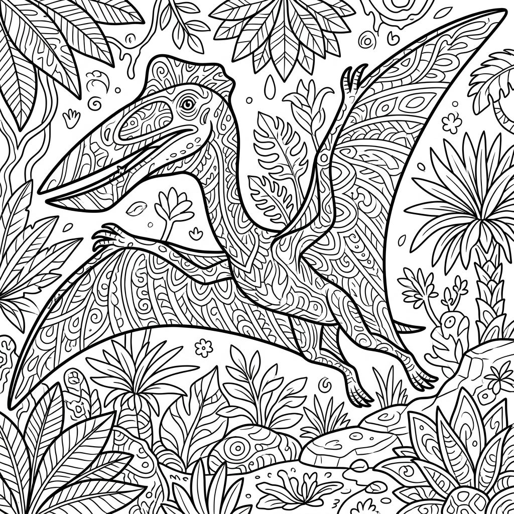 This isn't just a coloring page; it's an opportunity for mindful relaxation and creative expression. Each section, from the Hatzegopteryx's powerful wings to the intricate leaves of the ancient plants, is a canvas for your imagination. Lose yourself in the meditative process of bringing this prehistoric scene to life, finding tranquility as you choose your palette and apply your colors to its elaborate designs.