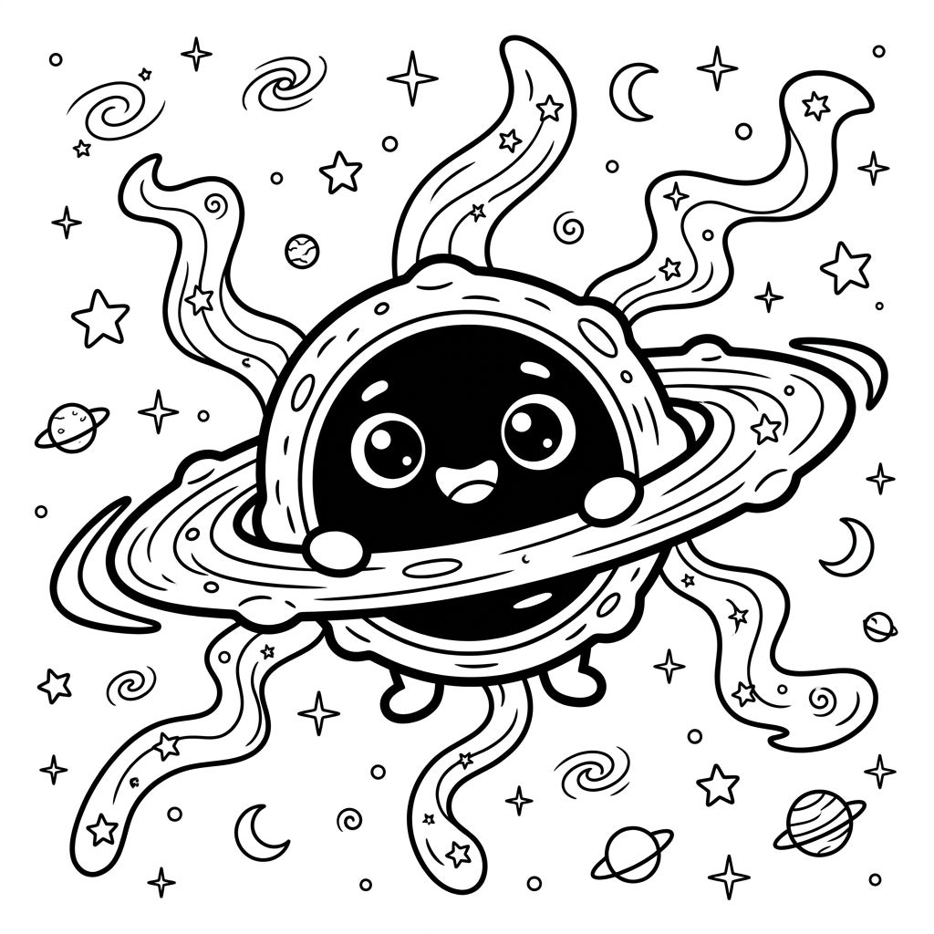 Unleash your child's creativity with our 'Hawking Radiation' inspired coloring page, where science meets adorable fun! This charming illustration features a super cute black hole character, complete with big, friendly eyes and a cheerful smile, ready to explore the vastness of space. Surrounded by majestic rings, reminiscent of Saturn, this little cosmic friend is not just a black hole, but a gateway to a universe of colors and imagination.