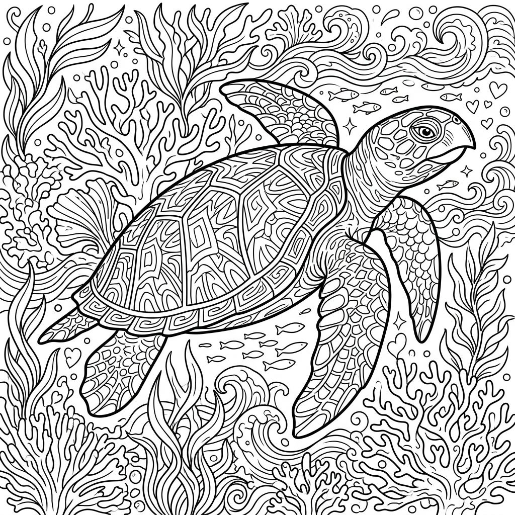 Unleash your creativity with this intricate Hawksbill Sea Turtle coloring page, specially designed for teens. Explore a vibrant underwater world filled with detailed coral, seaweed, and fascinating marine life.