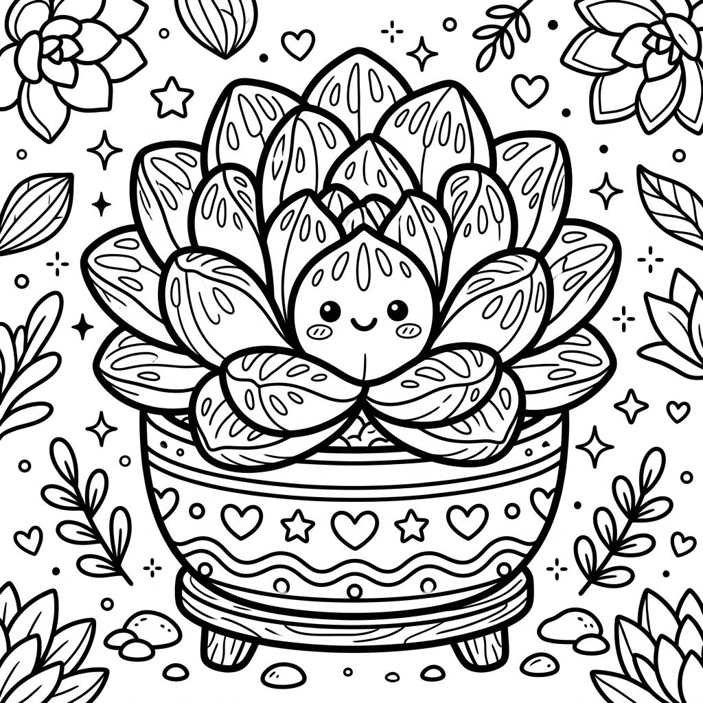 Surrounding our cheerful succulent are scattered elements of nature and joy – delicate leaves, tiny hearts, and sparkling starbursts that fill the page with whimsical charm. This arrangement creates a joyful and calming atmosphere, perfect for a moment of creative relaxation. Whether you're a succulent enthusiast or simply love cute illustrations, this coloring page promises to uplift your spirits and provide a peaceful artistic experience. It's a wonderful way to bring a touch of Kawaii garden magic into your home.