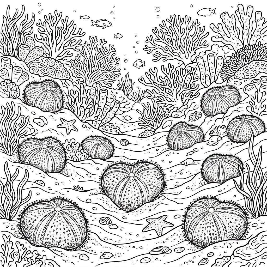 This intricate coloring page invites you to explore a vibrant underwater world, teeming with life and wonder. At its heart, several distinctive heart urchins, known for their unique shape, rest peacefully on the textured sandy seabed. Surrounding them is a rich tapestry of marine flora and fauna, including delicate branching corals, waving seaweed, and sturdy tube sponges, all meticulously detailed to offer a comprehensive "full scene" experience.