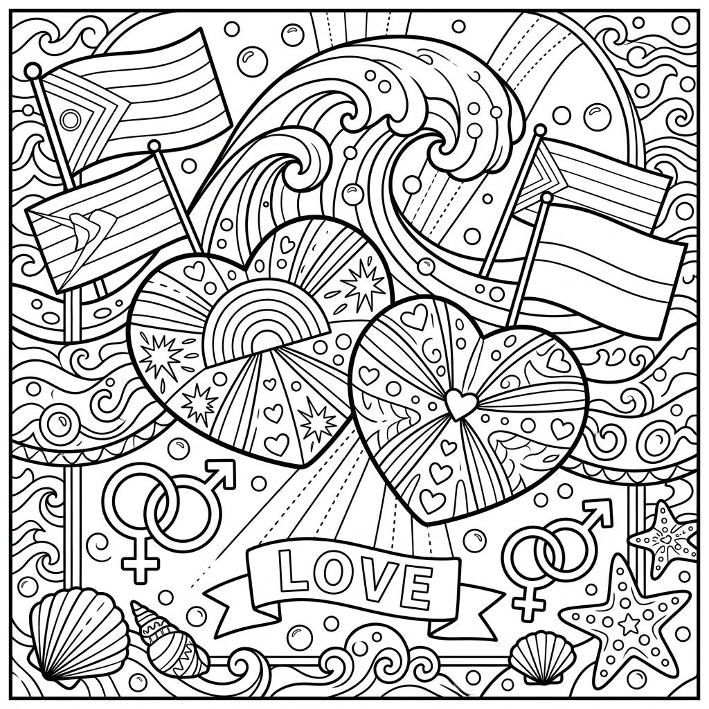 Discover a heartwarming scene where two charming heart-shaped sea urchins take center stage, adorned with intricate patterns ready for your creative touch. They are nestled amidst dynamic ocean waves and playful bubbles, creating a lively underwater backdrop. Flanking them are two fluttering flags, striped to represent the vibrant colors of the rainbow, while a prominent banner proudly declares 'LOVE.' Look closely to find charming details like linked gender symbols, delicate seashells, and a starfish scattered across this delightful marine landscape.