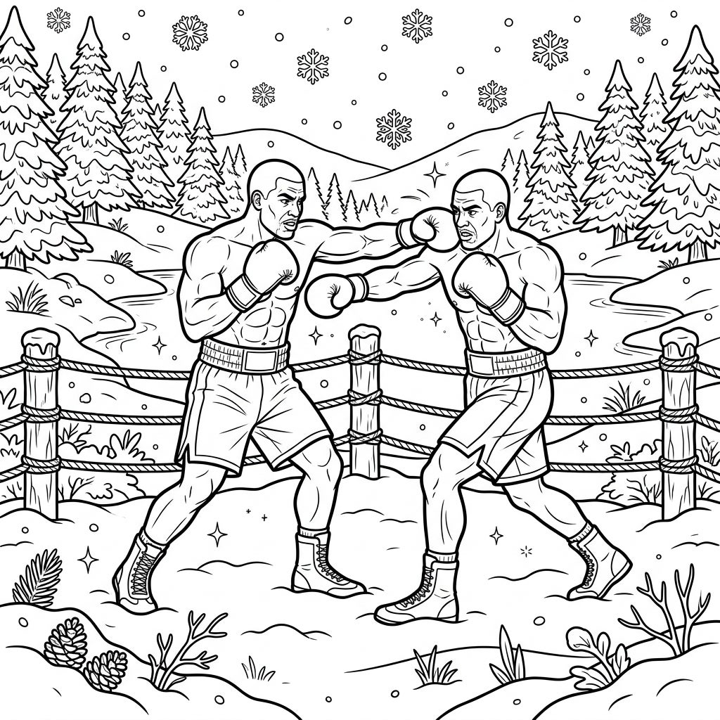 This isn't your average boxing match; it's a thrilling showdown set against the breathtaking backdrop of a winter wonderland. Imagine the crisp, cold air, the muffled sounds of punches in the snow, and the shimmering beauty of falling snowflakes. The serene, frosty environment, adorned with majestic pine trees and rolling snow-covered hills, creates a dramatic contrast with the intense athletic action, inviting you to bring this extraordinary scene to life with your colors.