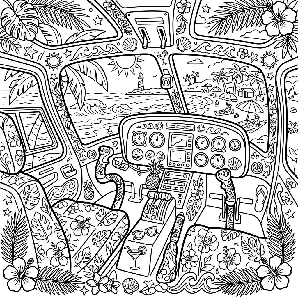 To make this helicopter cockpit come alive, consider using a palette that evokes the warmth of summer. Bright yellows and oranges for the sun, a spectrum of blues for the sky and ocean, and lush greens for the palm trees and tropical foliage will set the scene. Don't forget to add pops of vibrant color to the hibiscus flowers and patterns on the seats. You can even experiment with metallic pens for the instruments or shiny sunglasses to add a realistic touch. Let your imagination be your co-pilot as you navigate through this exciting summer adventure, transforming lines into a colorful masterpiece!