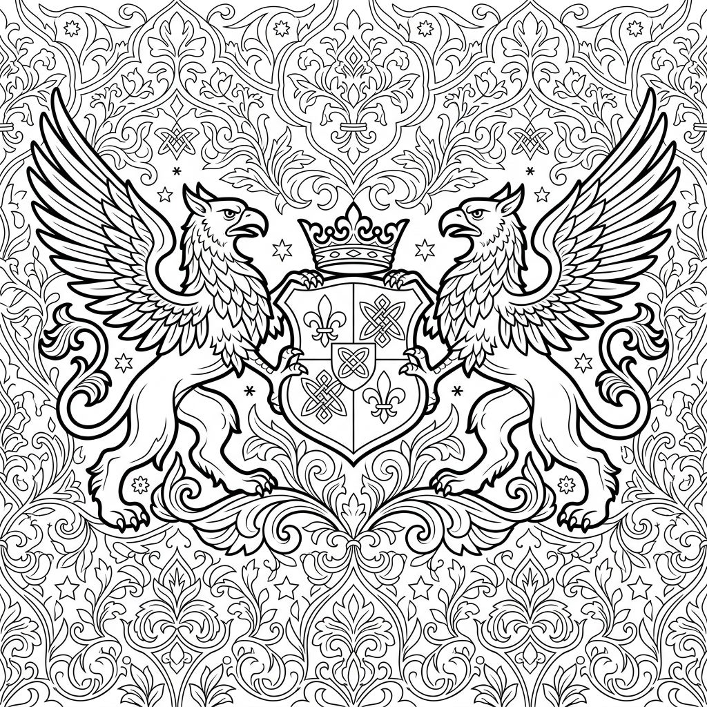 Discover the grandeur of heraldry with this intricate coloring page featuring two regal griffins flanking a royal crest. Immerse yourself in a world of mythical beasts and detailed patterns, perfect for a relaxing creative escape.