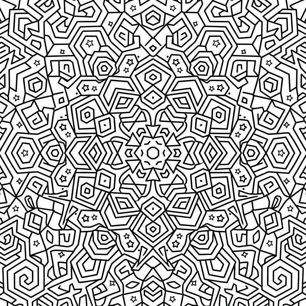 Immerse yourself in the captivating world of geometric art with this stunning hexagonal mandala coloring page. This intricate design is a masterpiece of radial symmetry, meticulously crafted with an abundance of six-sided patterns, squares, spirals, and small stars that weave together to form a mesmerizing visual tapestry. Each segment radiates from the center, inviting your eyes to explore the depth and complexity of its structure, promising a truly engaging and detailed coloring experience.