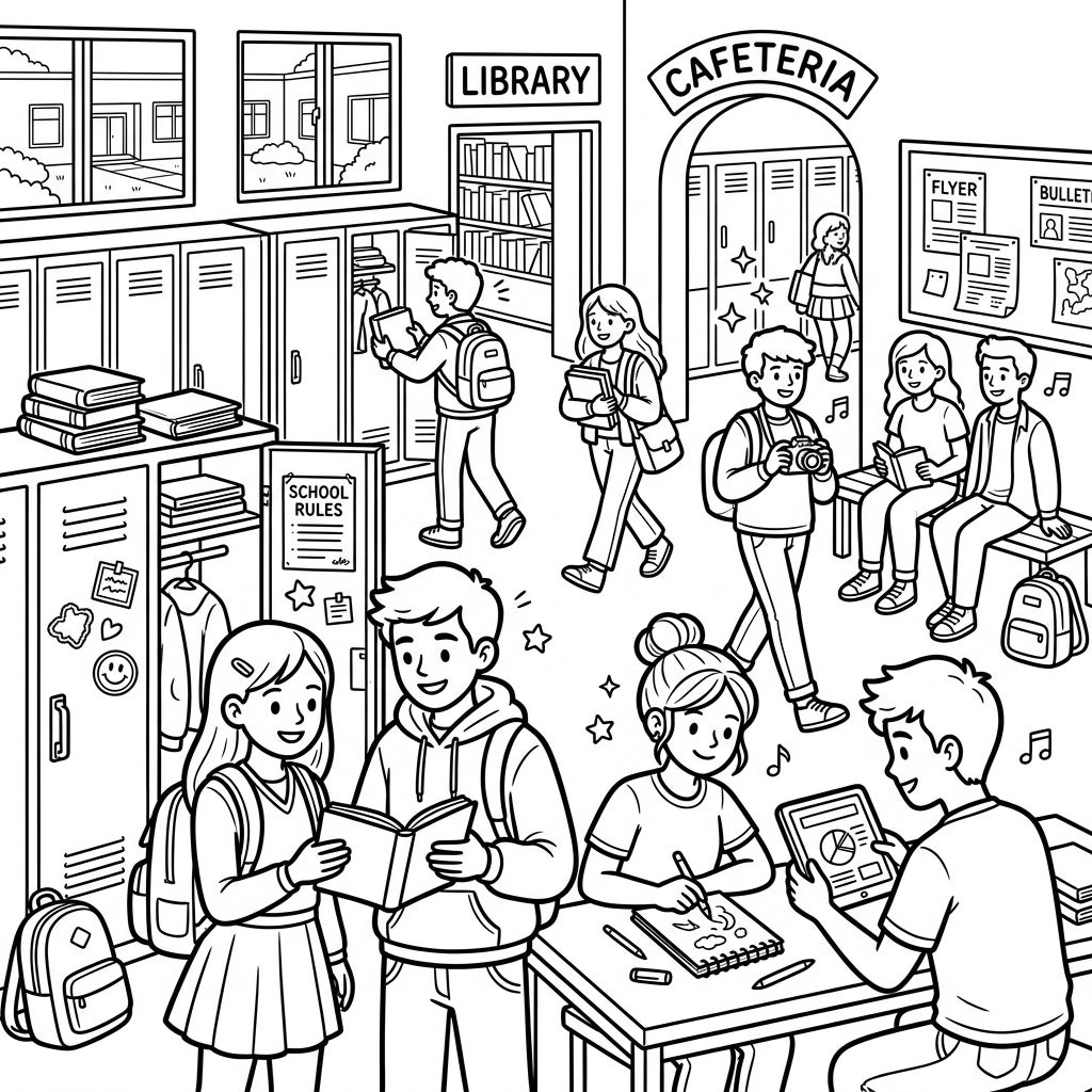 Get ready for a vibrant school day adventure with this lively coloring page! Join high school students as they explore the library, cafeteria, and lockers, bringing their bustling world to life with your favorite colors.