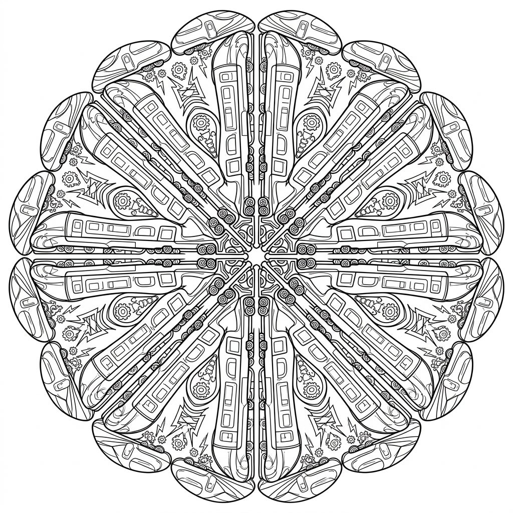 Experience the thrill of high-speed travel combined with the calming rhythm of mandala coloring. As you fill in each segment, you'll find yourself on a meditative journey, transforming black and white lines into a vibrant tableau of motion and stillness. This design is perfect for those who appreciate the beauty of complex machinery and the profound tranquility offered by symmetrical art, inviting you to de-stress and unleash your inner artist.