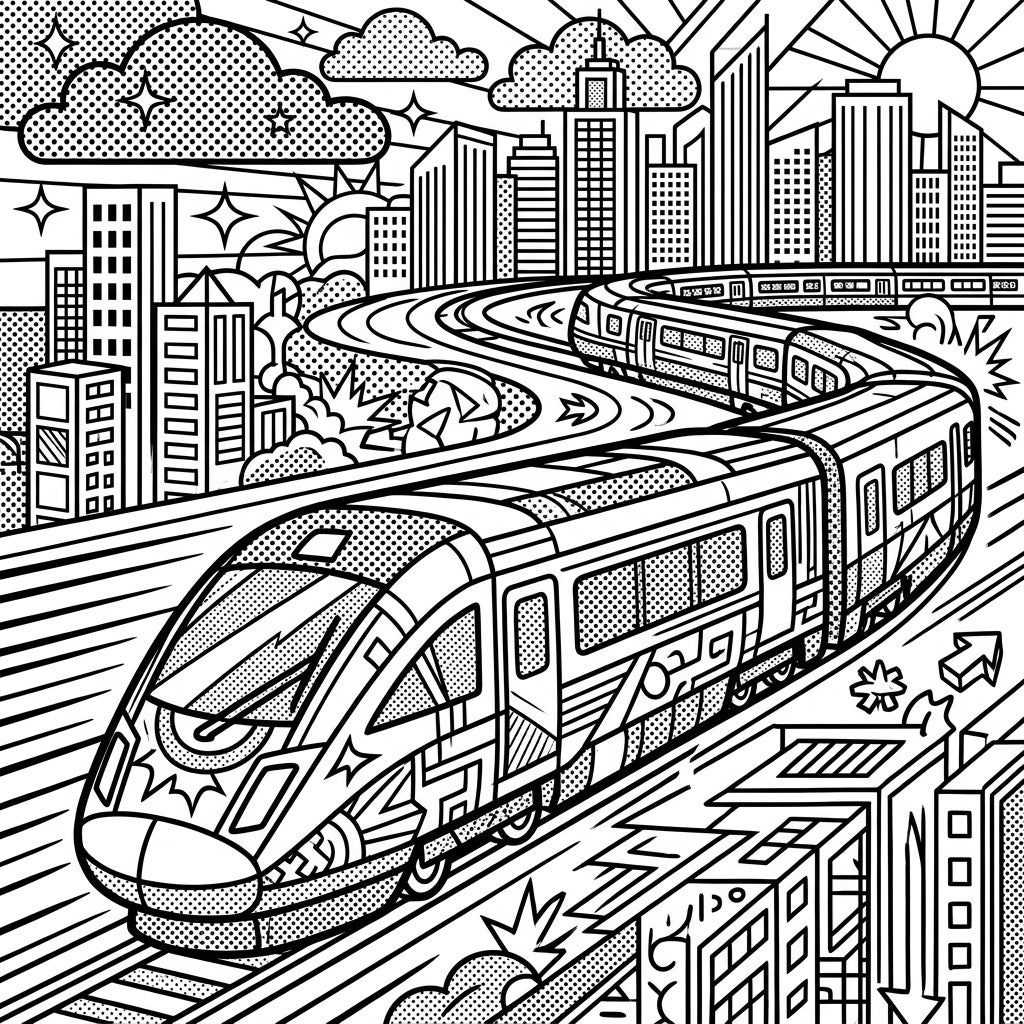 Dive into a world where speed meets iconic art with this mesmerizing High-Speed Train Pop Art coloring page. This intricate design showcases a futuristic high-speed train, rendered with bold outlines and captivating patterns, as it navigates a winding track through a bustling metropolis. Look closely, and you'll discover classic Pop Art elements like halftone dot textures on the clouds and buildings, alongside comic-book-inspired starbursts and speed lines that amplify the sense of rapid motion. The detailed city background, complete with towering skyscrapers and urban structures, provides a rich tapestry for your creative expression.