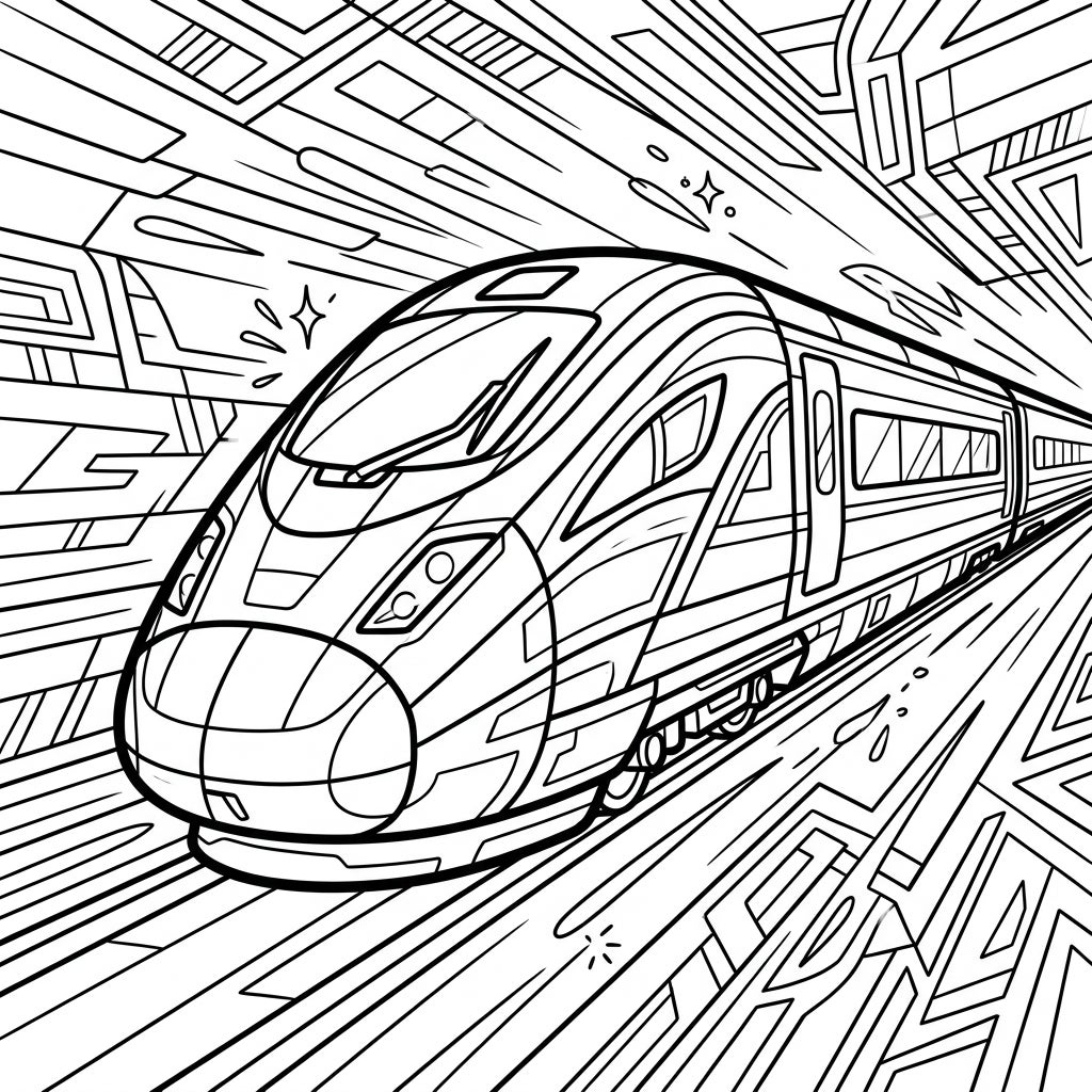 Dive into the intricate details of a magnificent high-speed train, captured mid-journey on this dynamic coloring template. This design highlights the train's state-of-the-art aerodynamic form, from its sharply pointed nose to its sleek, continuous windows and sophisticated body panels. The surrounding background bursts with abstract, geometric lines that emanate outwards, ingeniously conveying the incredible velocity and energy of this modern marvel, inviting you to explore every curve and angle with your artistic touch.